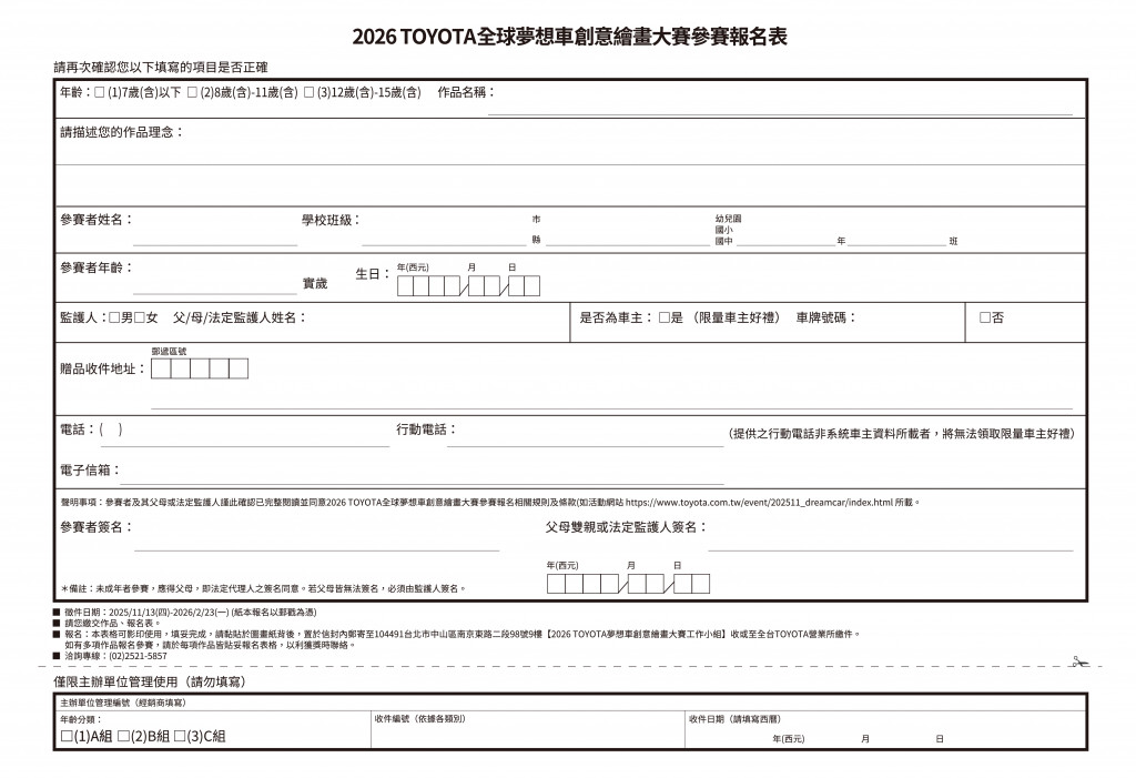 「2026 TOYOTA 全球夢想車創意繪畫大賽」正式開放報名囉!